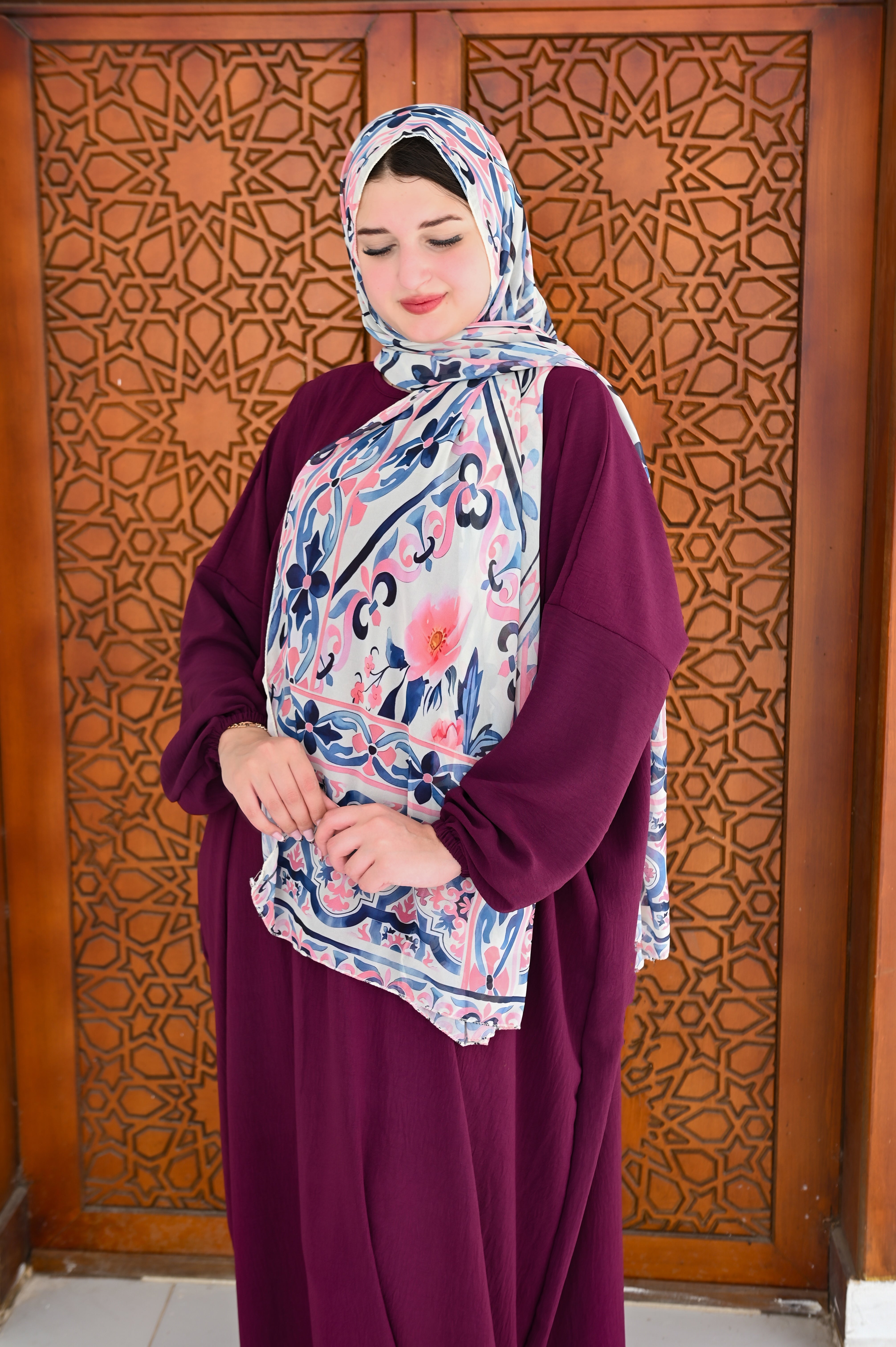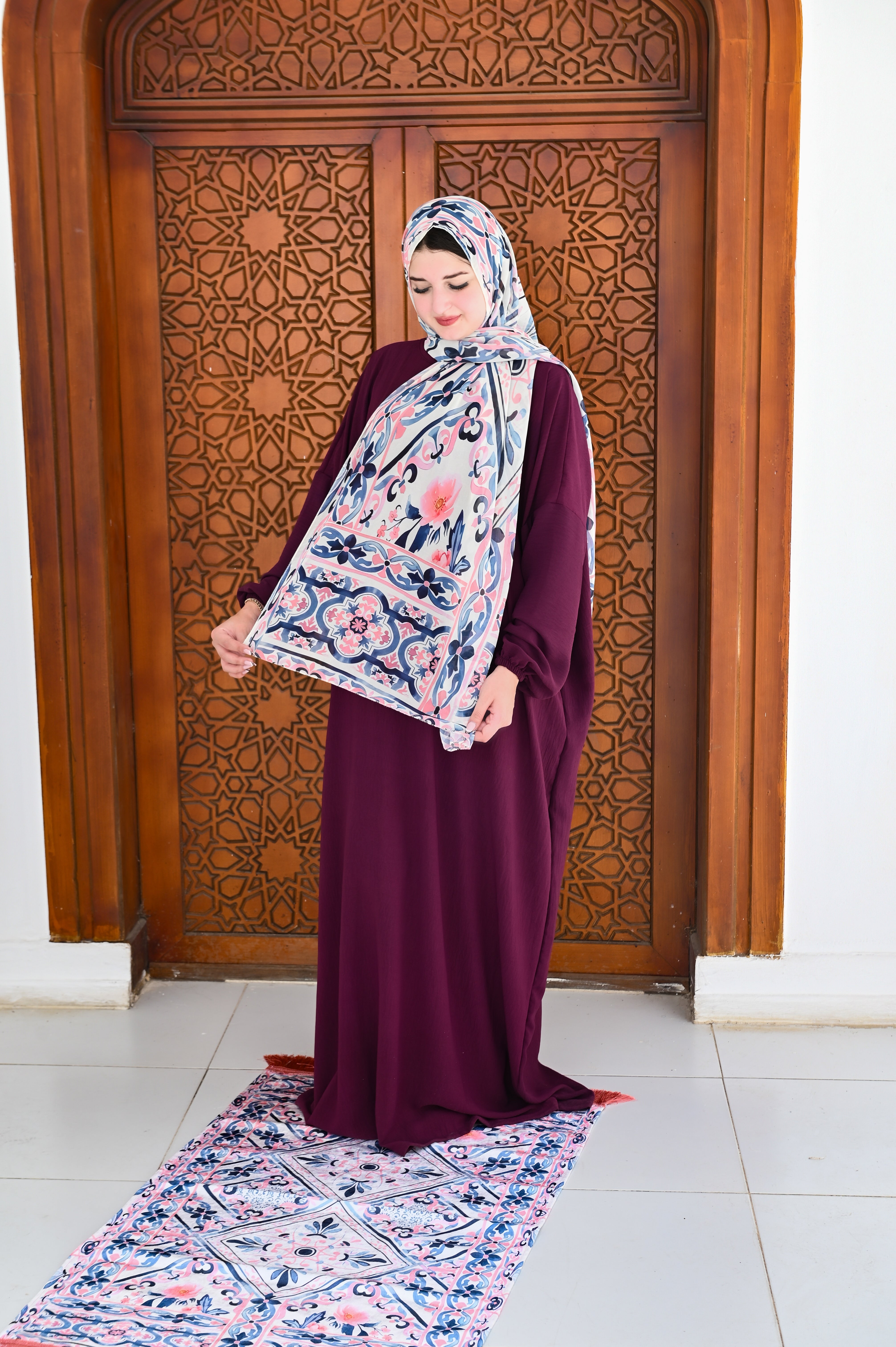 ✨ طرحة عملية – مزودة برمز أو تطريز يعكس شكل السجادة، تضيف لمسة فريدة للطقم وتبرز جماله.